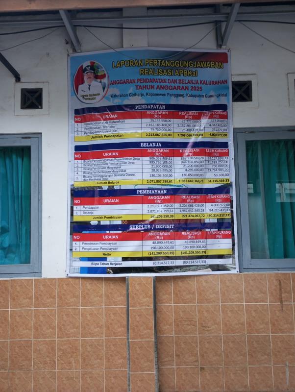 Sebagai bentuk transparansi dan akuntabilitas pengelolaan keuangan desa, Pemerintah Kalurahan Giriharjo menyampaikan Laporan Pertanggungjawaban Realisasi Anggaran Pendapatan dan Belanja Kalurahan (APBKal) Tahun Anggaran 2025 sebagai berikut: